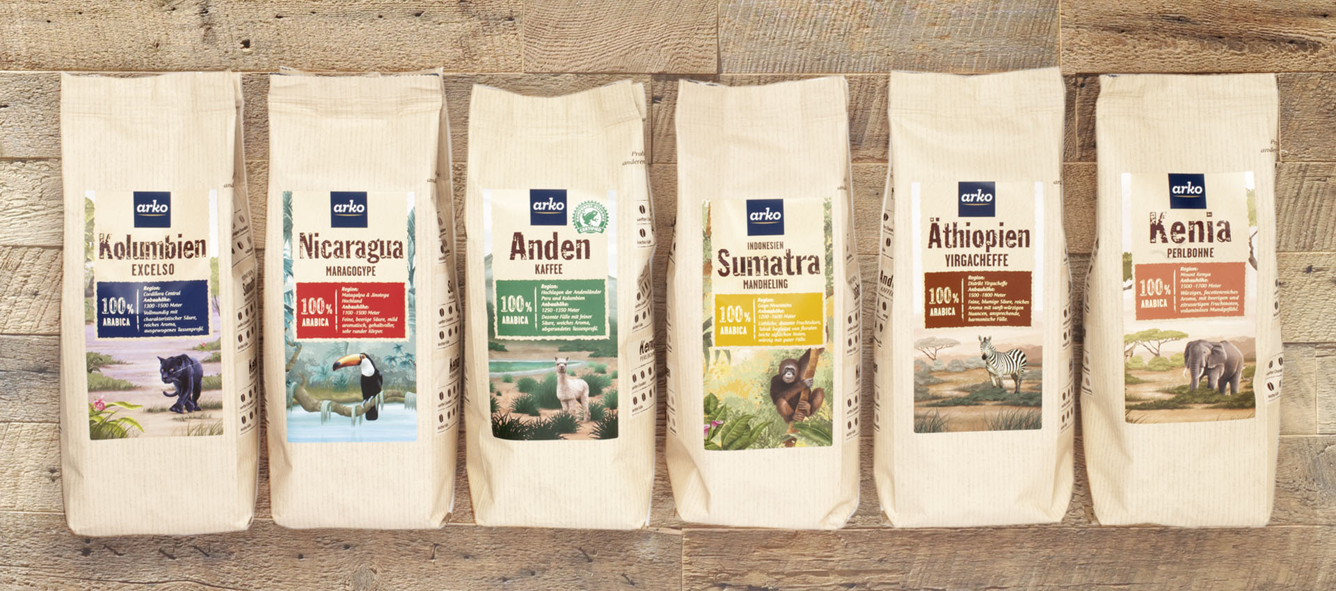 Die 6 Sorten differenzieren sich über die Illustrationen der Tiere und Pflanzen aus den Ursprungsländern und über eine deutliche Farbcodierung.